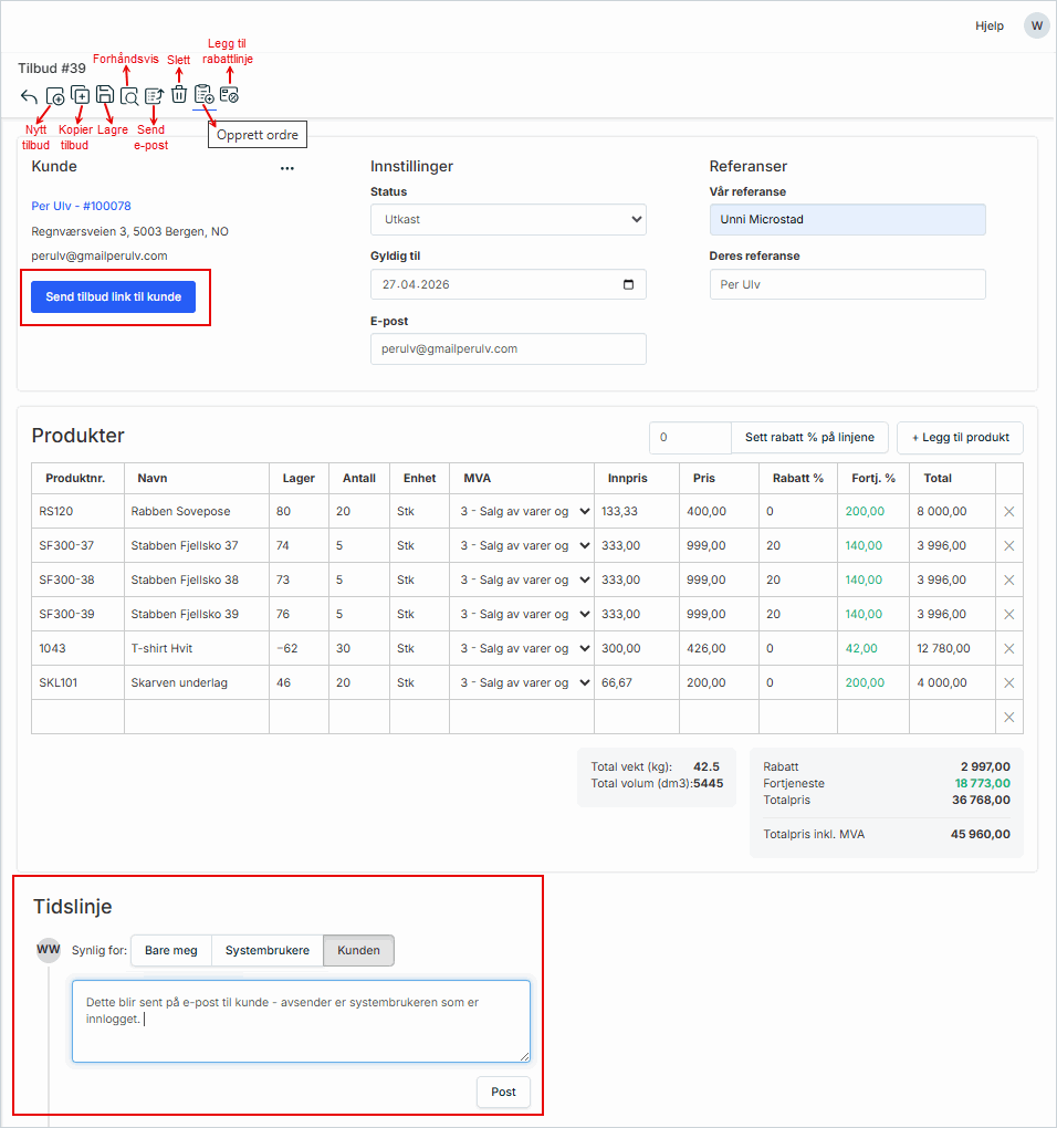 Kunden kan også skrive en kommentar i Timeline-feltet, som du ser i tidslinjen i tilbudet.