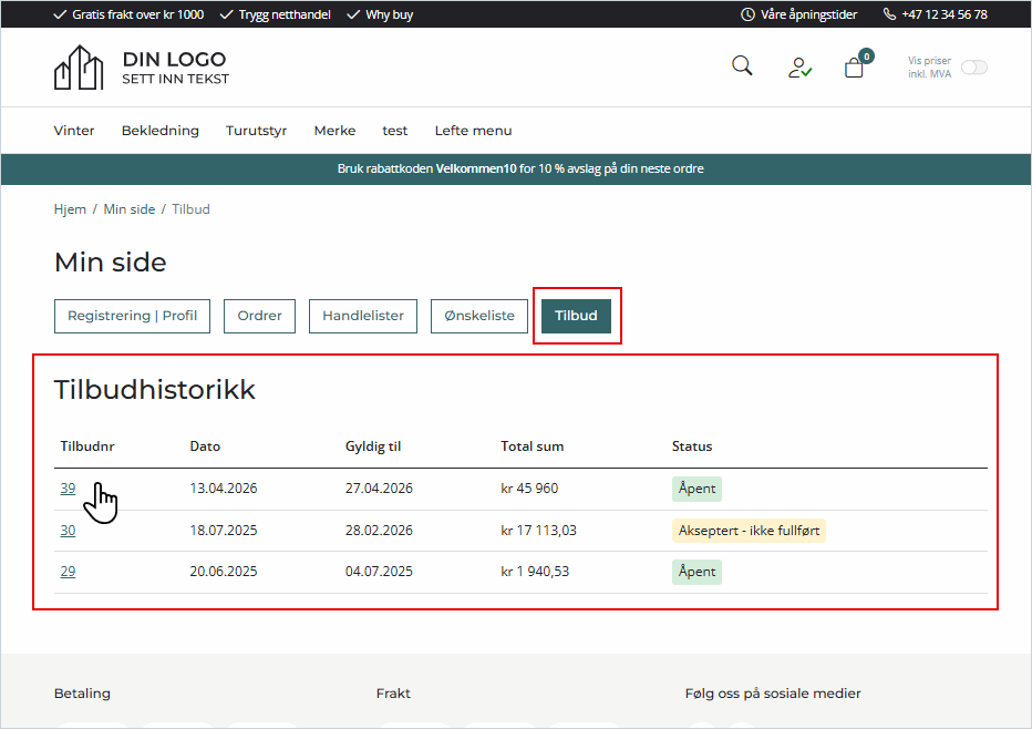 Kunden logger inn i nettbutikken og går til Min side. Der klikker kunden på Tilbud-fanen for å se en oversikt over alle tilbud. Kunden klikker på tilbudsnummeret for å åpne tilbudet.