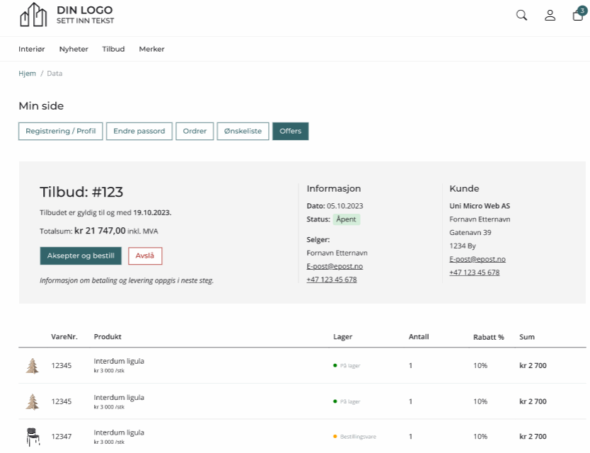 Når tilbudet er klart, sendes det til kunde via e-post. Via en unik link vil kunden kunne åpne tilbudet i nettbutikken for gjennomgang. Fra tilbudet kan kunden velge