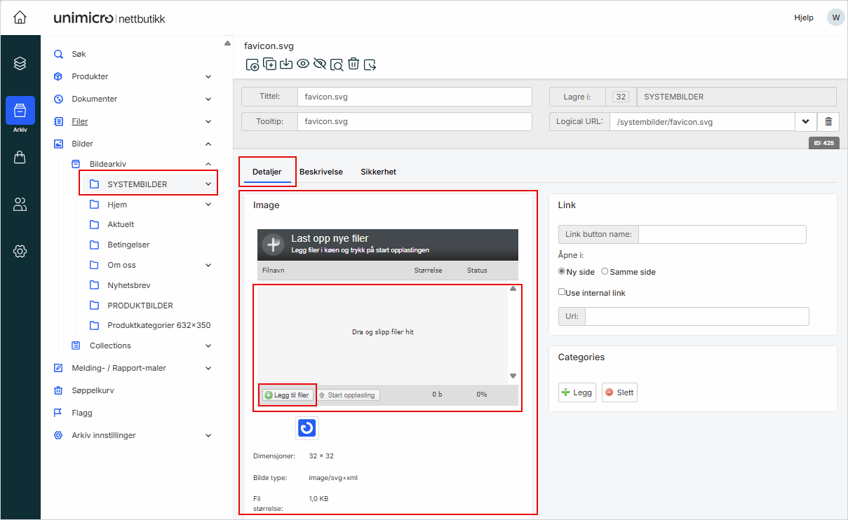 For at faviconet skal fungere, må du laste det opp i nettbutikkens bildearkiv, i mappen SYSTEMBILDER. Nettbutikksystemet er satt opp til å hente ikonfilen herfra, og bruker den deretter på nettadressen og i nettleseren. Det betyr at du slipper å gjøre noe med kode eller innstillinger – systemet gjør jobben så snart bildet ligger på riktig sted.