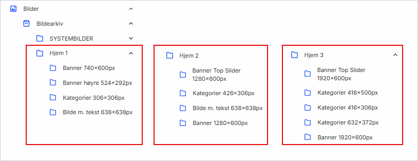 Hver mappe viser de tilgjengelige bildeseksjonene og deres anbefalte bildestørrelser: Banner 1920x600px
