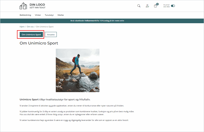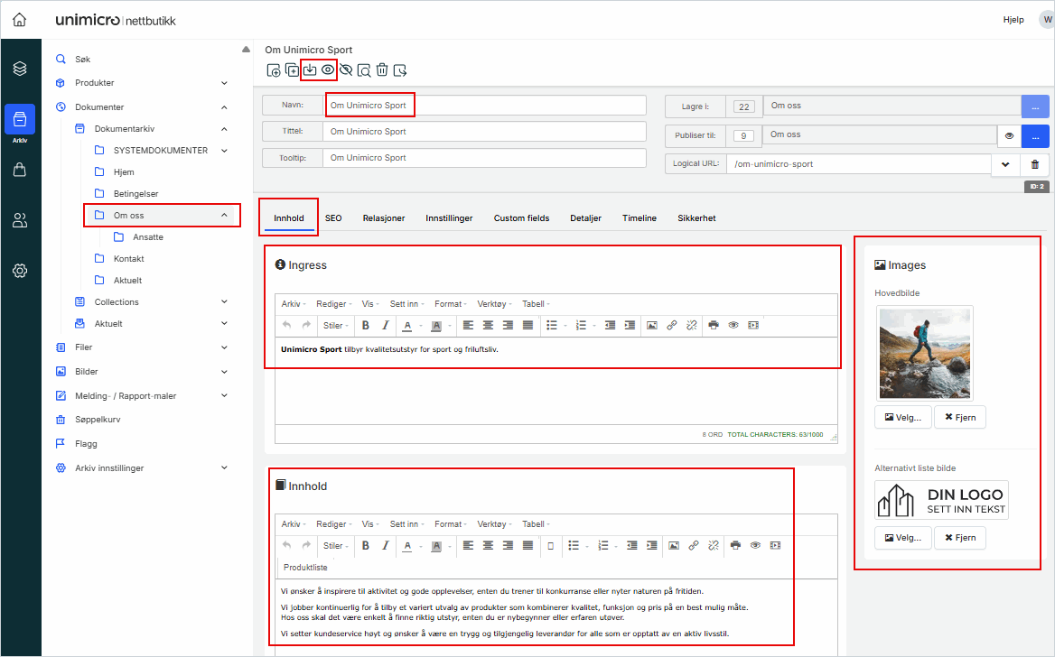 Gå til fanen Innhold og skriv inn hovedteksten om bedriften