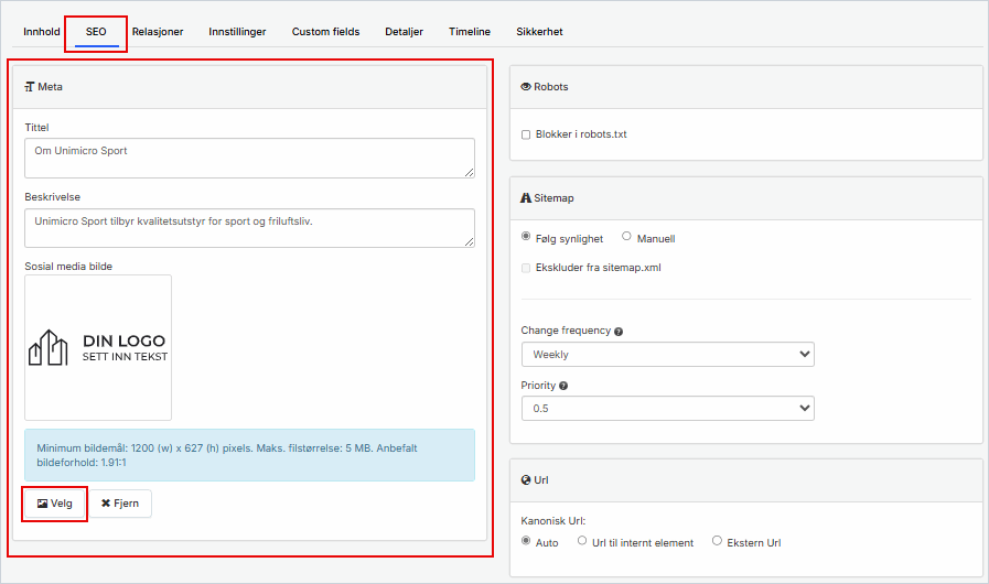Under Sosial media bilde kan du laste opp et bilde som vises når siden deles i sosiale medier