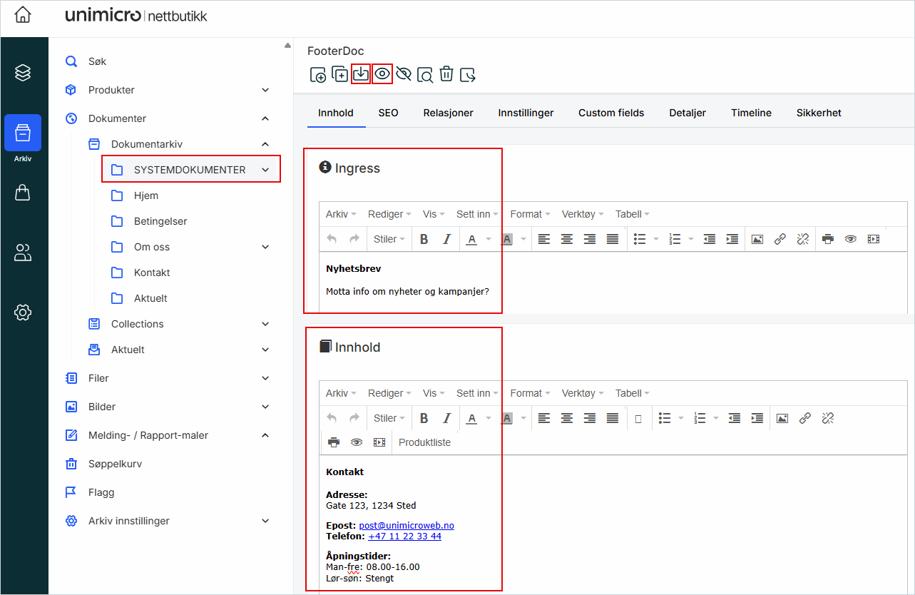 Begge feltene redigeres samlet i samme dokument: FooterDoc.