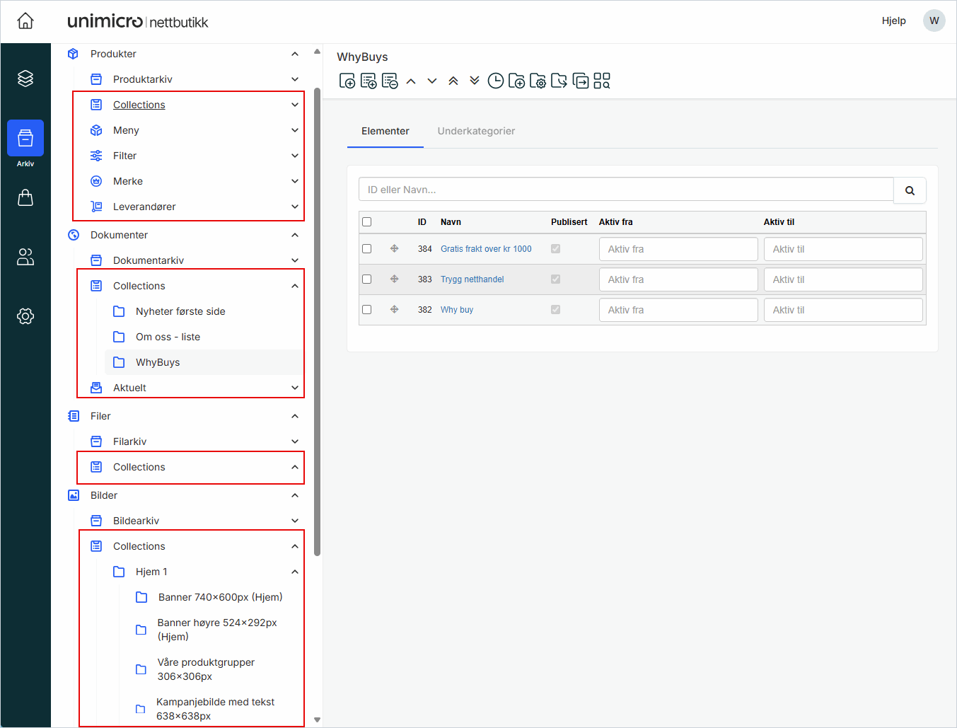 Oppsummert kan du tidsstyre alt innhold som ligger i produktlister, kategorier og Collections, innholdet må være tatt ut av arkivet å lagt til i en samling.