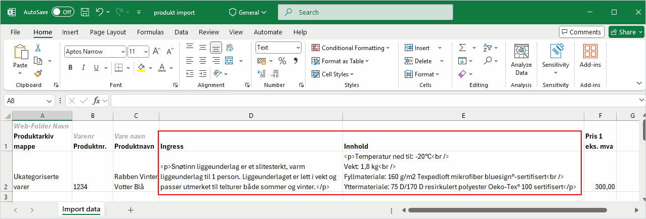 Bildet under viser hvordan teksten må være skrevet i Excel-filen du importerer. Her er både ingress og innhold korrekt formatert med HTML.