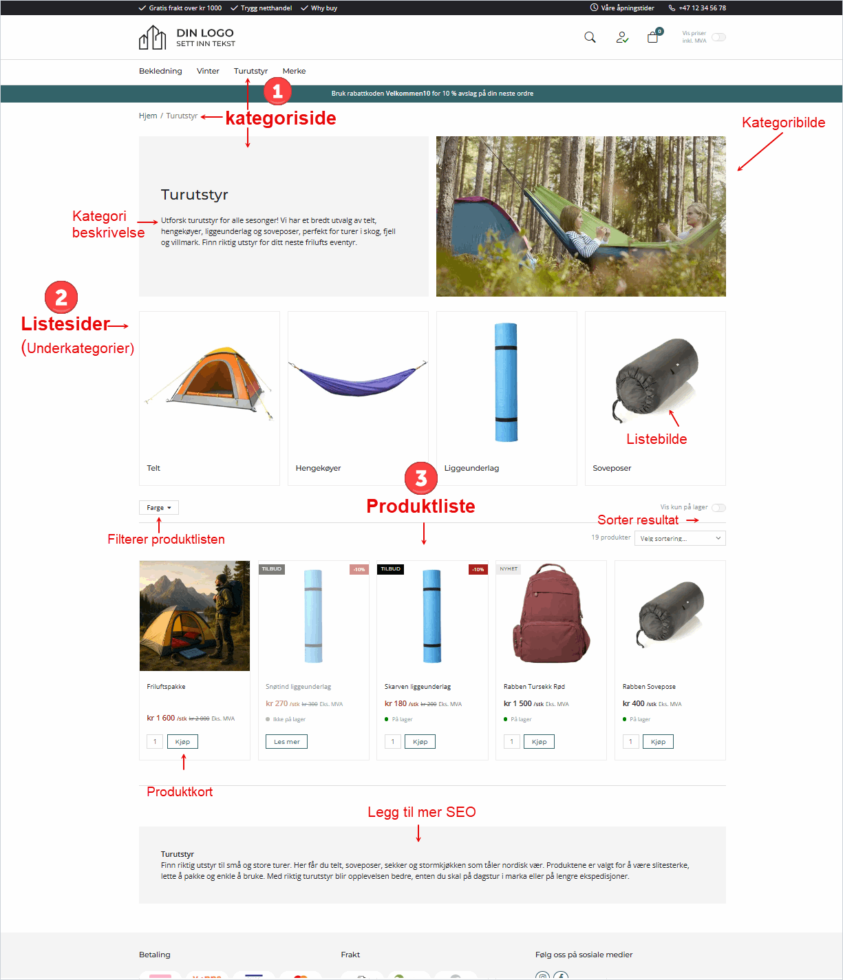 En kategoriside er landingssiden som vises når kunden klikker på et menypunkt og som består av flere deler som til sammen gir struktur og flyt. Siden fungerer både som inngang til produktene og som et viktig område for søkemotoroptimalisering (SEO).