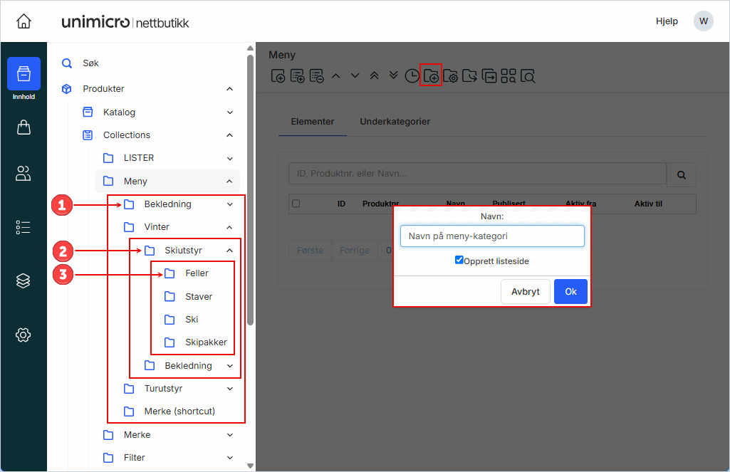 I administrasjonen kan du opprette hovedkategorier, legge til underkategorier og eventuelt velge om kategorien skal ha en listeside (kategoriside).
