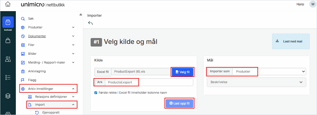 For å oppdatere produktdata i Excel og legge inn endringene tilbake i systemet, kan du kombinere denne funksjonen med importfunksjonen i Arkiv innstillinger