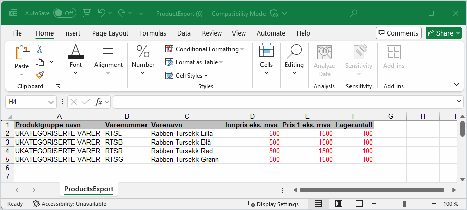 2. Systemet oppretter en Excel-fil med de valgte produktene