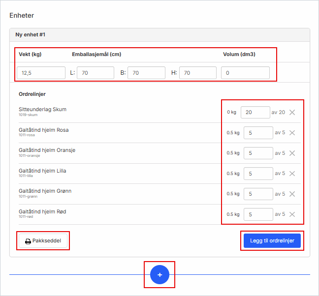 6. Klikk på + for å opprette et nytt kolli hvis ordren skal deles i flere kolli