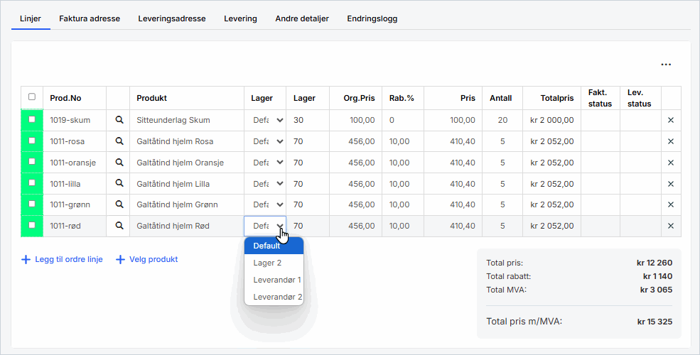 Når alle produktene er lagt til vil ordrelinjene se slik ut