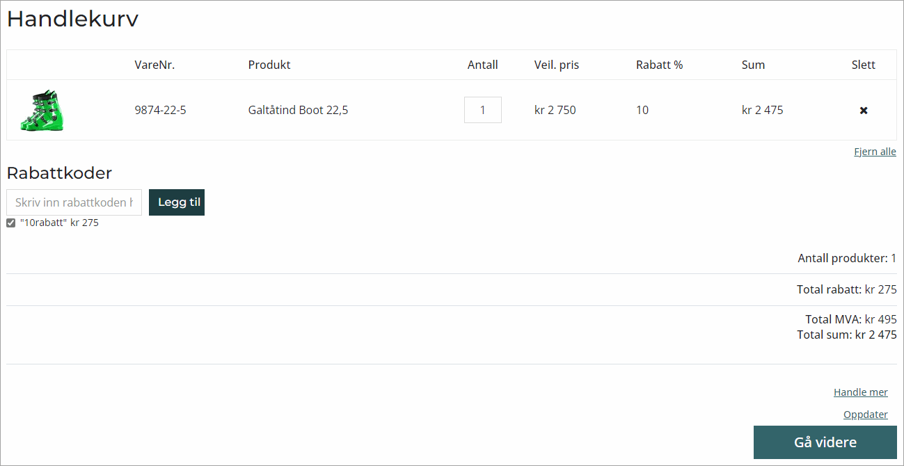 Når du har laget en rabattkode, test alltid at den fungerer som tenkt i utsjekken. Her legger jeg inn koden som er laget: