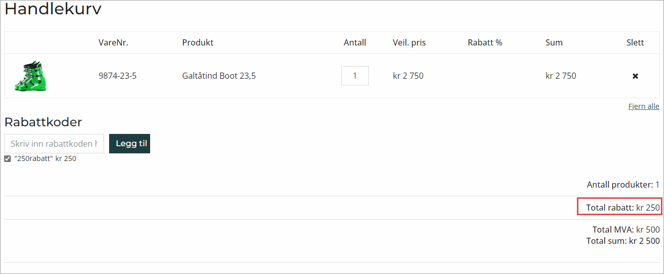 2. Sett inn ønsket rabatt i rabattbeløp (ink. MVA) i dette eksempelet 250