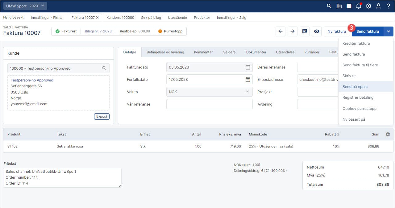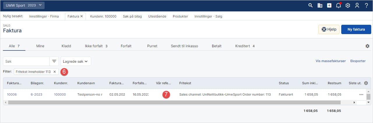 7. Her er ordre 113 tilgjengelig i fakturalisten og kan sendes / skrives ut til kunde