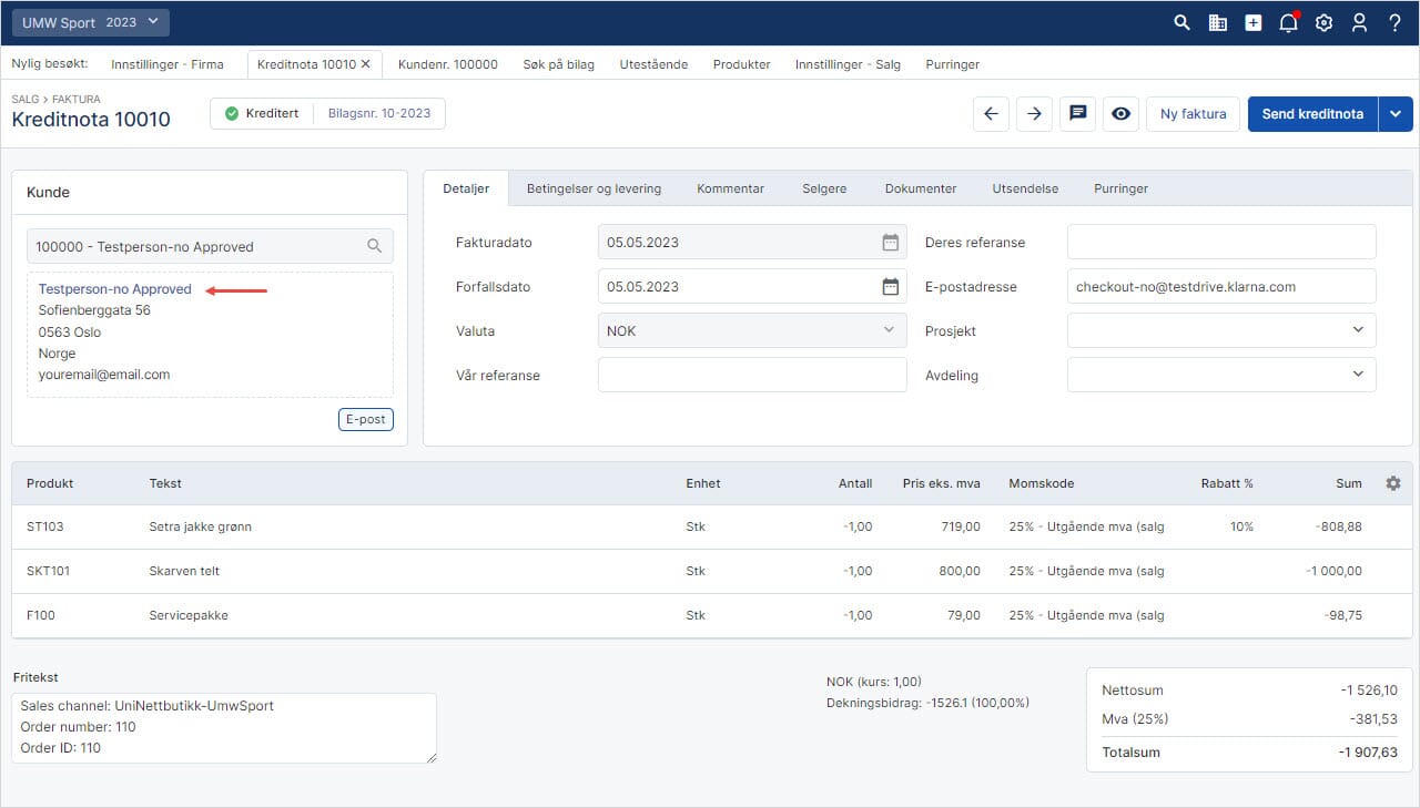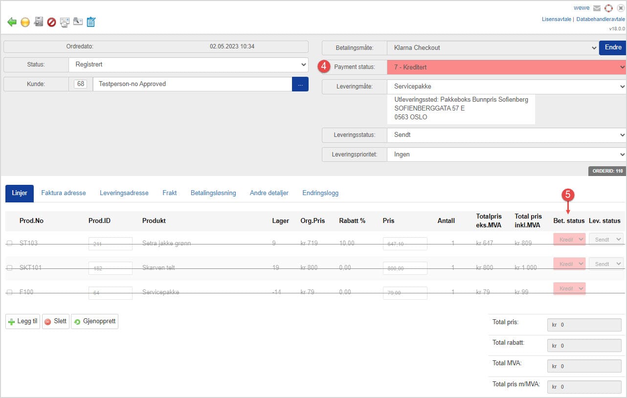 4. Ordre er nå kreditert og har fått betalingsstatus "Kreditert"